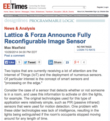2014年10月29日–現在大きな注目を集めている2つのトピックは、モノのインターネット(IoT)と多数のセンサーの導入です。特に興味深いのは、スマートセンサーと「エッジでの処理」の概念です。たとえば、誰かが部屋にいるかどうかを検出し、この情報を使用してライトをアクティブまたは暗くするセンサーの場合を考えてみます。このタイプのアプリケーションに使用された元の技術は、動きの検出に使用されたPIR(パッシブ赤外線)センサーなど、比較的単純なものでした。これらの古いテクノロジーの問題の1つは、インテリジェンスの欠如でした。その結果、部屋の居住者が長時間動きを止めた場合には照明が消えてしまいました。