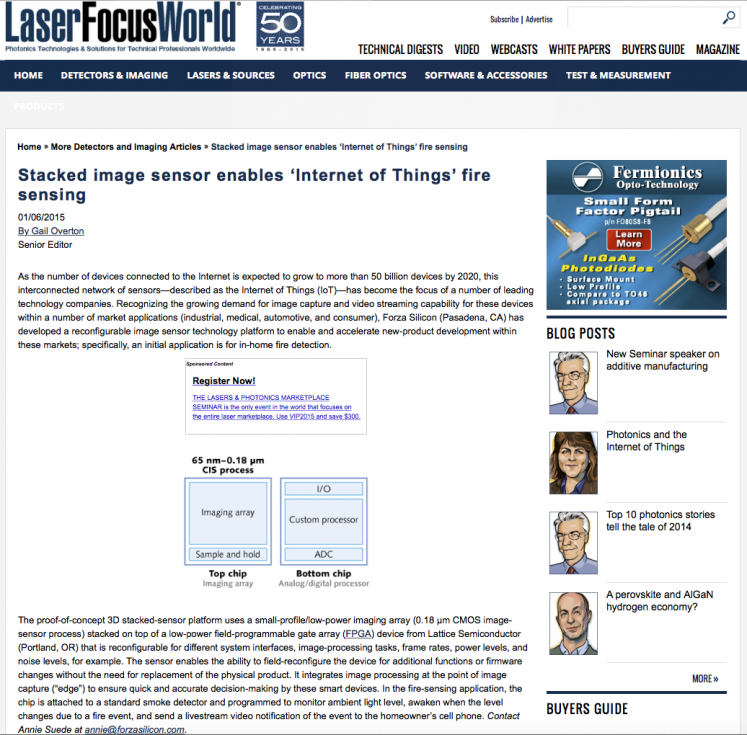 2015年1月6日–インターネットに接続されるデバイスの数が2020年までに500億を超えるデバイスに増加すると予想されるため、モノのインターネット(IoT)と呼ばれるこの相互接続されたセンサーネットワークが多くの大手テクノロジー企業の注目を集めています。 Forza Silicon(Pasadena、CA)は、多くの市場アプリケーション(産業、医療、自動車、および消費者)内でのこれらのデバイスの画像キャプチャおよびビデオストリーミング機能に対する需要の高まりを認識し、再構成可能なイメージセンサーテクノロジープラットフォームを開発して、実現および加速しました。 これらの市場における新製品の開発。 具体的には、最初のアプリケーションは家庭内の火災検知用です。