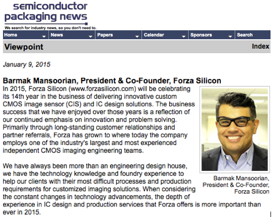 2015年1月9日– 2015年、フォーザシリコン(www.forzasilicon.com)は、革新的なカスタムCMOSイメージセンサー(CIS)およびIC設計ソリューションを提供する事業で14年目を迎えます。我々が長年にわたって享受してきたビジネスの成功は、革新と問題解決に引き続き重点を置いていることを反映しています。